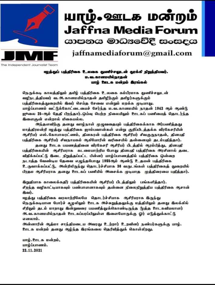 அன்னாரின் ஆத்மா சாந்தியடைய அவரது உற்றார் உறவினர் நண்பர்களுக்கு யாழ். ஊடக மன்றம் தனது ஆழ்ந்த இரங்கலை தெரிவித்துக் கொள்கிறது.எனக் குறிப்பிடப்பட்டுள்ளது.
